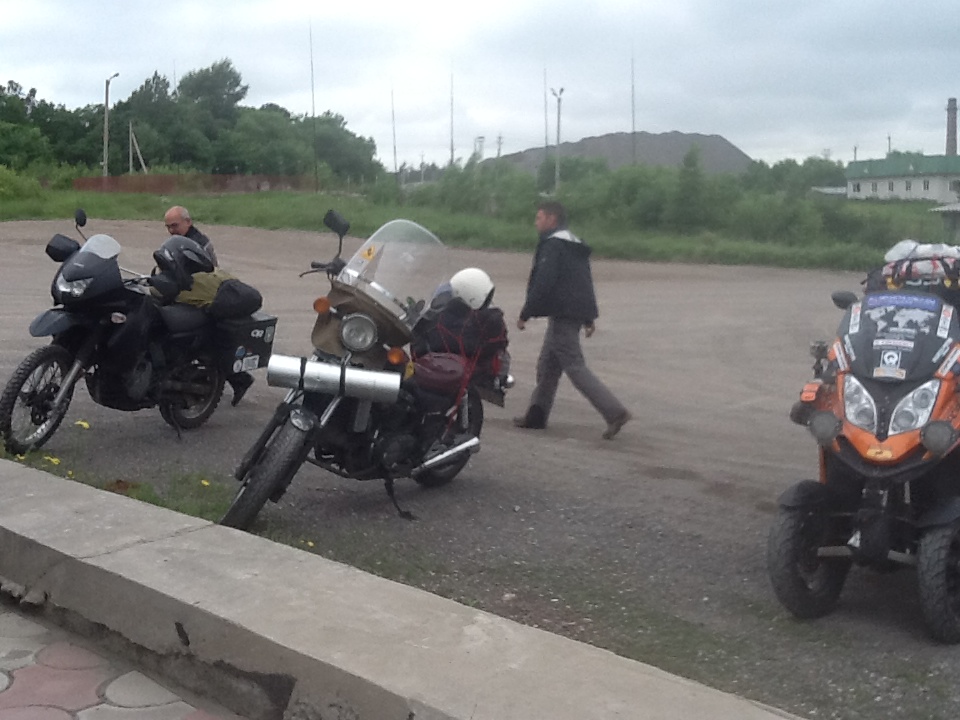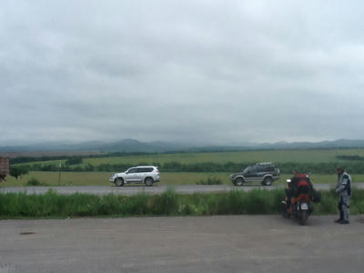 車が一緒にとまっていた。多分モリートを助けようとしたのだろうが、ロシア語が通じず、諦めたのだろう我々と入れ違いで去っていった。エンジンのステーが抜けかけて、エンジンが脱落しそうになったようだ。ステーというか長いボルトなのだが、それを戻す作業開始。実に時間がかかった。2-3時間も、ロシア人が助けてくれた。ジャッキを貸してくれたり、いろいろしてくれた。